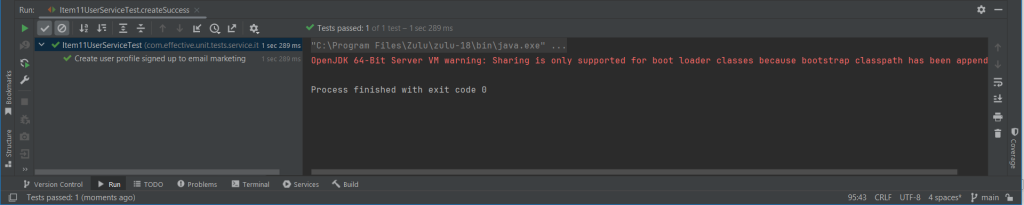 JUnit 5 introduced the new @DisplayName annotation so that developers could use more descriptive languages for their unit tests. So I would consider using it going forward to make test reports easier to read. I’ve never been a fan of the common unit test method naming conventions (and I’m pretty sure I’m not that good at it either), putting underscores in Java methods has never sat well with me :-), although that’s my problem. Using more descriptive language for unit test descriptions doesn’t really add any cost but should help describe what scenario each test is exercising. For example, for our tests you could do something like the below [Item11UserServiceTest.createSuccess()]: