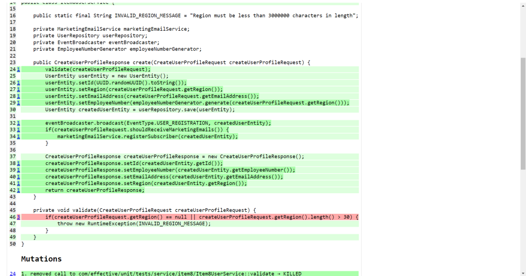 public static final String TEST_REGION = "US-EAST - THIS IS 30 CHAR LONG";And run the PIT tests again then the build is successful and the report is all green. PIT mutated that code to createUserProfileRequest.getRegion() < 29 and since our region is now 30 characters our happy path tests (at least) fail and PIT marks them as successfully killed.