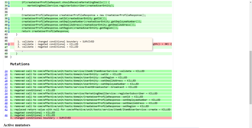 PIT mutation reports are currently a bit cryptic and can be awkward to read but what the red line (and its pop-up) are telling us here, is that PIT made 3 separate mutations associated with the if statement on line 46 and only 2 of the mutations [where the conditionals were negated] failed the tests (were killed). But 1 mutation [the boundary condition mutation] left the tests still passing (survived).