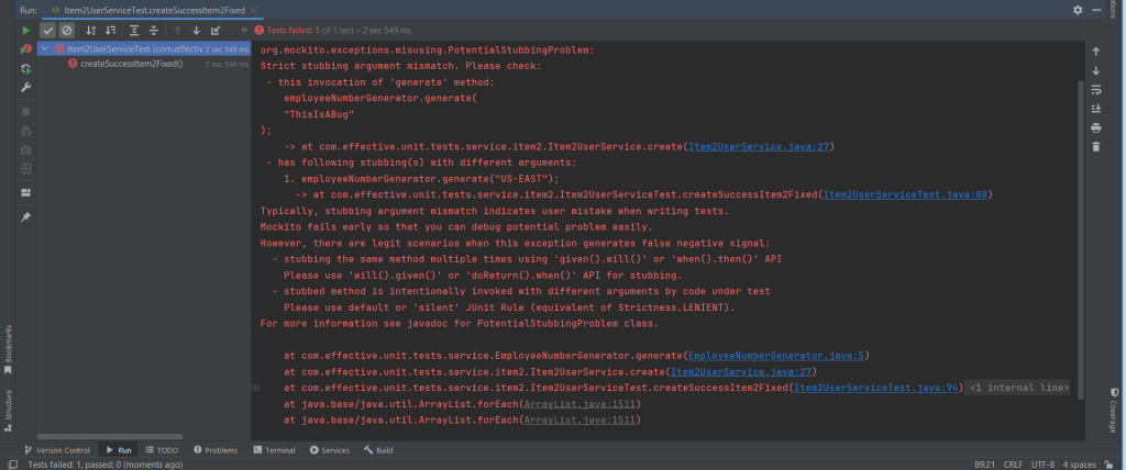 For this item we’ll focus on the EmployeeNumberGenerator.generate() call. We’ve setup the mock as follows [See Item2UserServiceTest.createSuccessItem2Broken()]: