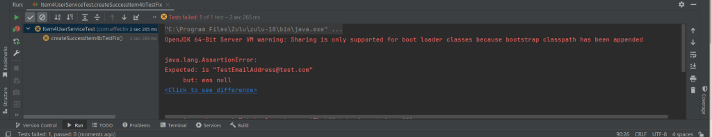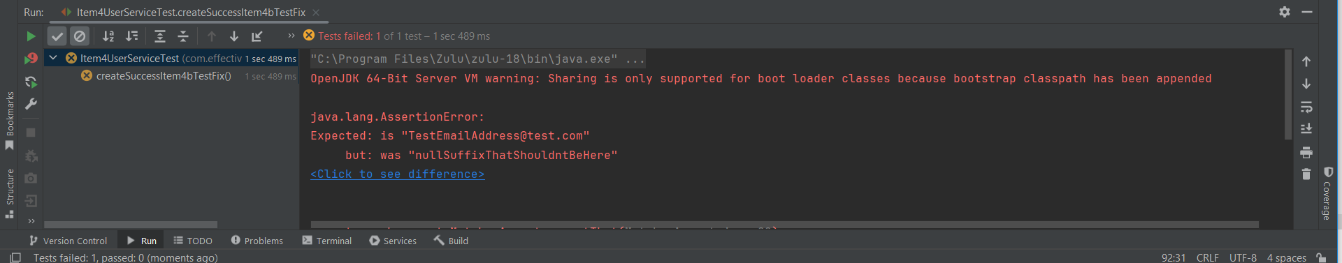 createUserProfileRequest.setEmailAddress(TEST_EMAIL_ADDRESS);After making this update the test now passes and takes care of the assertion error associated with problem 2 but it should fail due to problem 3 so there’s still more to do. On line 134 [Item4UserServiceTest.createSuccessItem4cTestFix()] we check that the ID of the createUserProfileResponse object is formatted like a UUID, but we don’t verify it’s exact value. Although we can’t control which UUID the code generates we don’t really have to in this case because the createUserProfileResponse.ID field is actually intended to be copied from the createdUserEntity object rather than the createUserProfileRequest or original userEntity objects (even though it’s currently not – that’s the bug). In this case it’s the test which creates a mocked object (called mockedSavedUserEntity) and sets the ID to a known value (the TEST_UUID constant). So we should update the code to assert this intent by changing the assert to [Item4UserServiceTest.createSuccessItem4dTestFix())]: