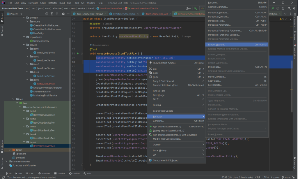 You can do this easily in IntelliJ by highlighting the code block ā right-click ā Refactor ā Extract Method as shown in the following screenshot. Or even better, just highlight the code and hit CTRL+ALT+M in windows.